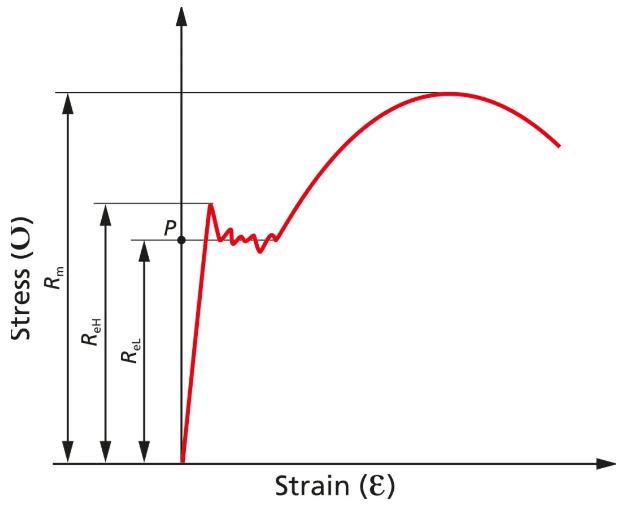 上屈服強(qiáng)度ReH、下屈服強(qiáng)度ReL處在同一種材料的應(yīng)力-應(yīng)變曲線中的不同位置。