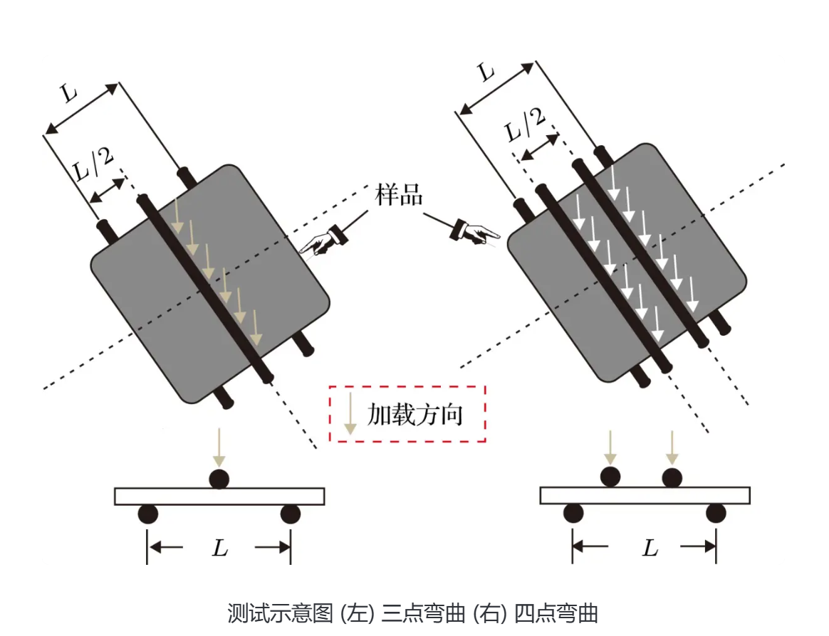 三點彎曲:樣品置于兩個支撐滾柱上,通過在跨中施加集中載荷使其發生彎曲。該方法操作簡便,對樣品表面及邊緣缺陷較為敏感,最大拉應力出現在加載點正下方的樣品下表面。